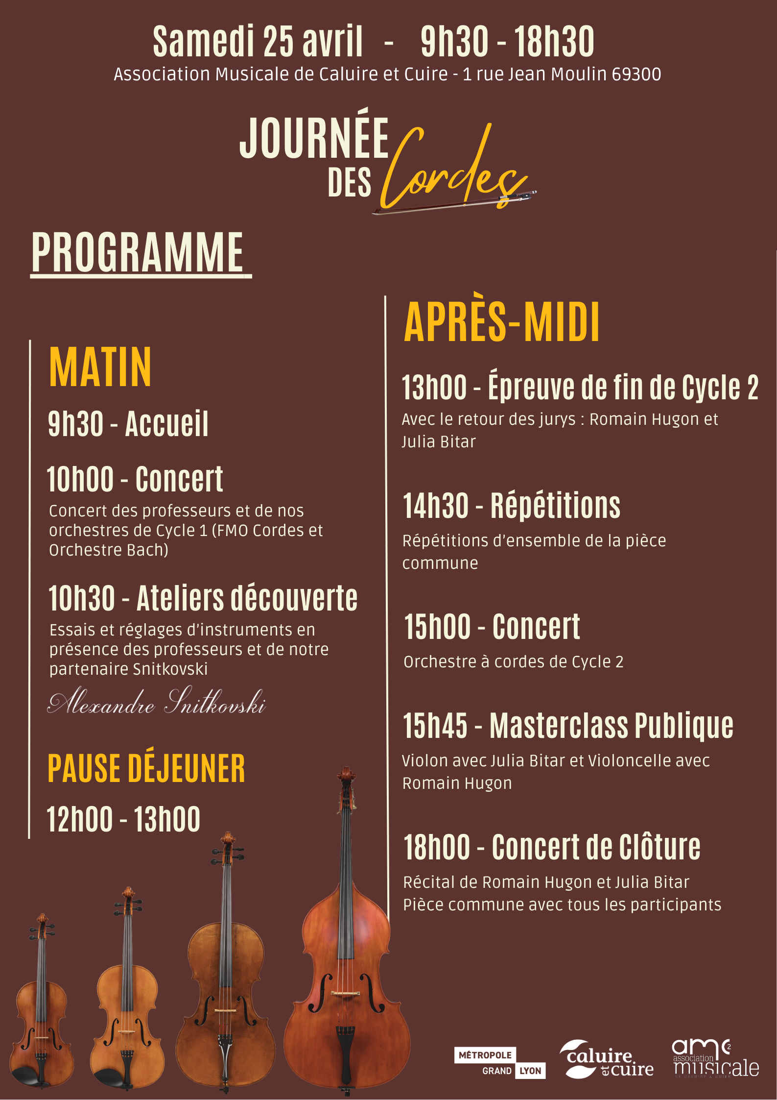 Le samedi 25 avril, l’AMC2 ouvre ses portes à la Journée des Cordes ! Venez rencontrer luthier, concertistes, musiciens et professeurs lors d’une journée ponctuée d’ateliers, Master Classe et concerts.